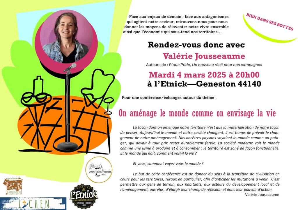 La Tête dans le Sable vous donne rendez-vous le mardi 4 mars à 20h au bar l’Etnick à Geneston pour une conférence donnée par Valérie Jousseaume intitulée « on aménage le monde comme on envisage la vie ».